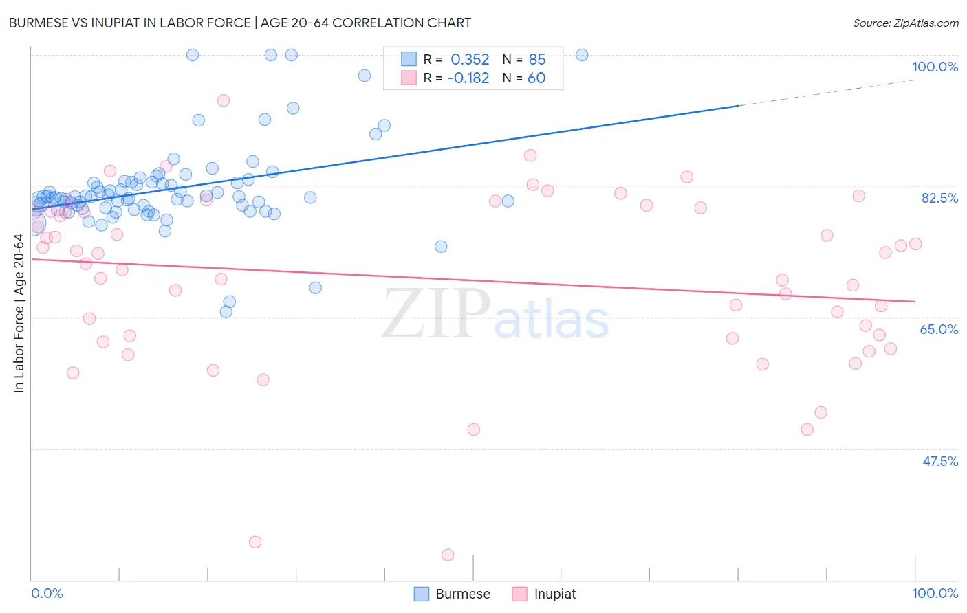 Burmese vs Inupiat In Labor Force | Age 20-64 Correlation Chart