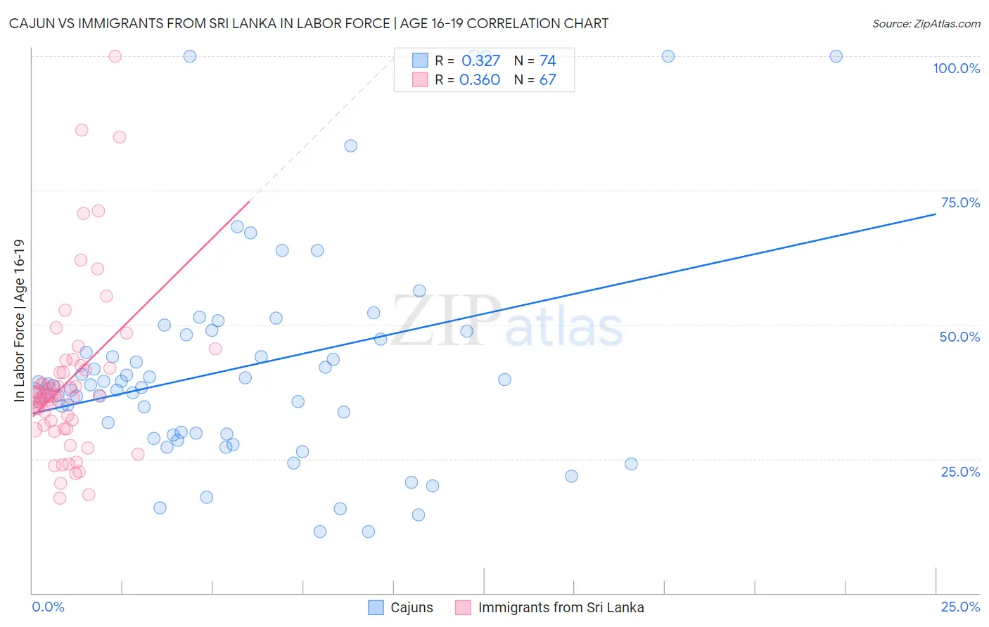 Cajun vs Immigrants from Sri Lanka In Labor Force | Age 16-19 Correlation Chart