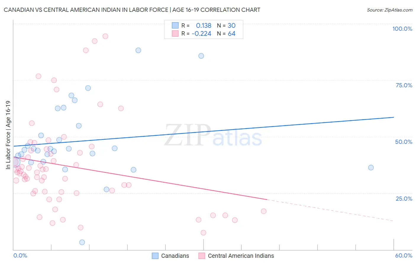 Canadian vs Central American Indian In Labor Force | Age 16-19 Correlation Chart