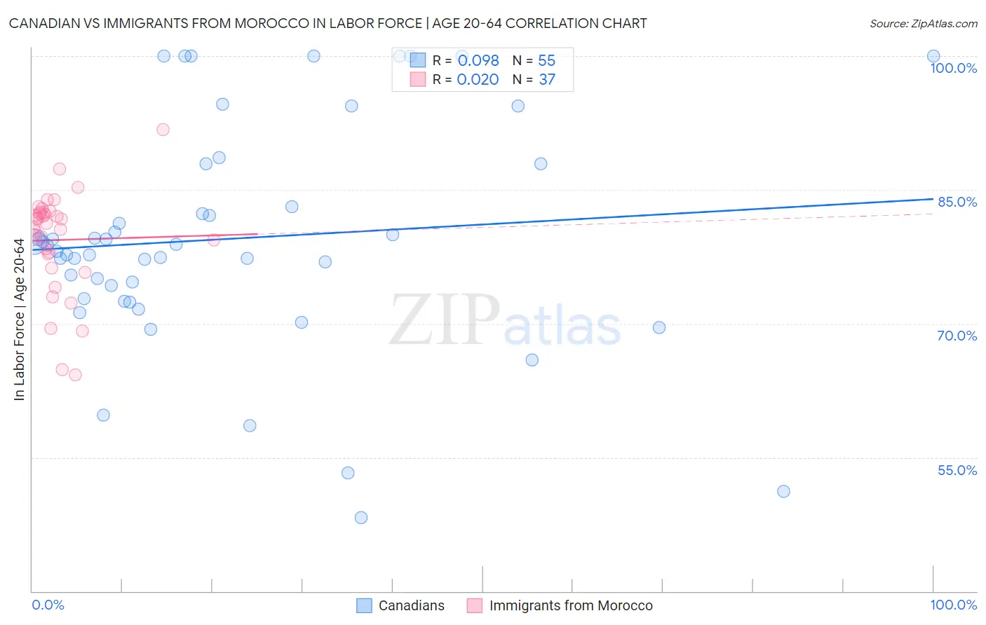 Canadian vs Immigrants from Morocco In Labor Force | Age 20-64 Correlation Chart
