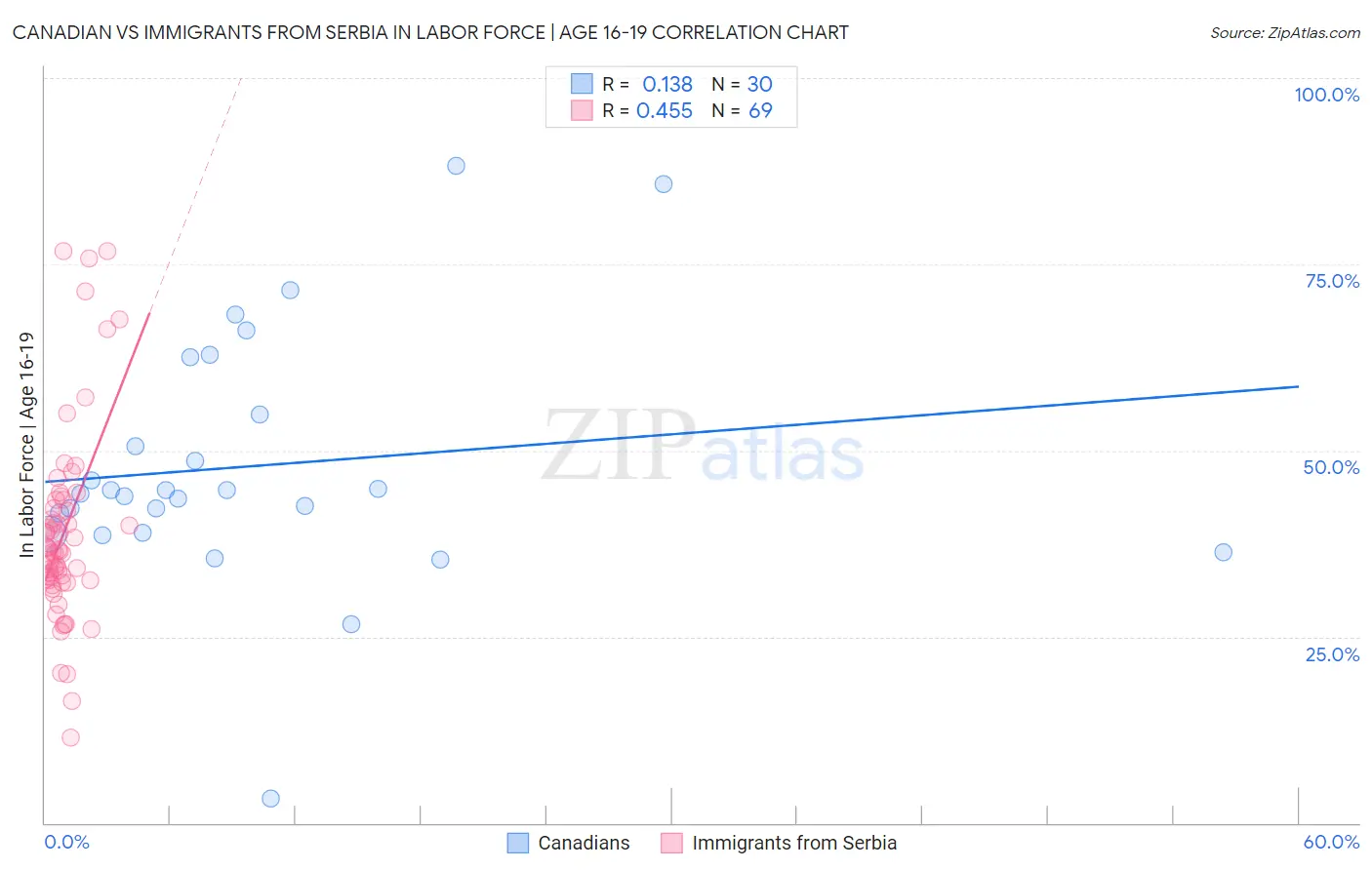 Canadian vs Immigrants from Serbia In Labor Force | Age 16-19 Correlation Chart
