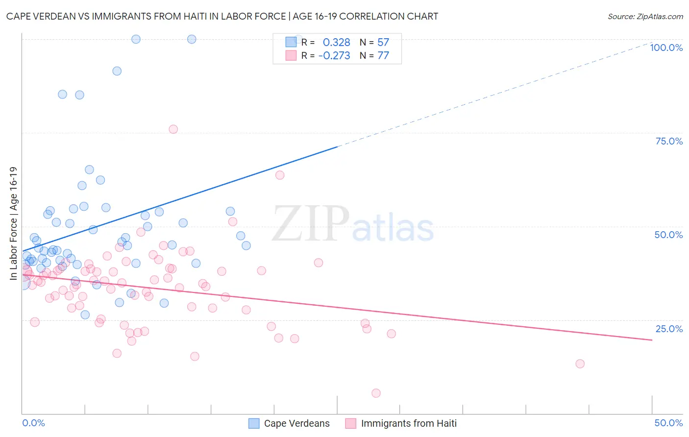 Cape Verdean vs Immigrants from Haiti In Labor Force | Age 16-19 Correlation Chart