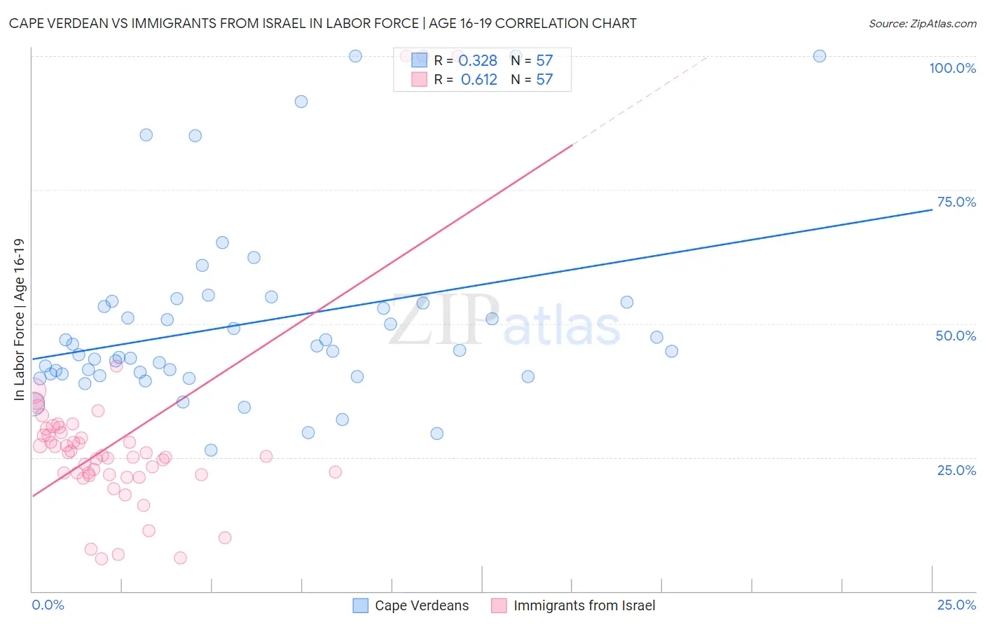 Cape Verdean vs Immigrants from Israel In Labor Force | Age 16-19 Correlation Chart