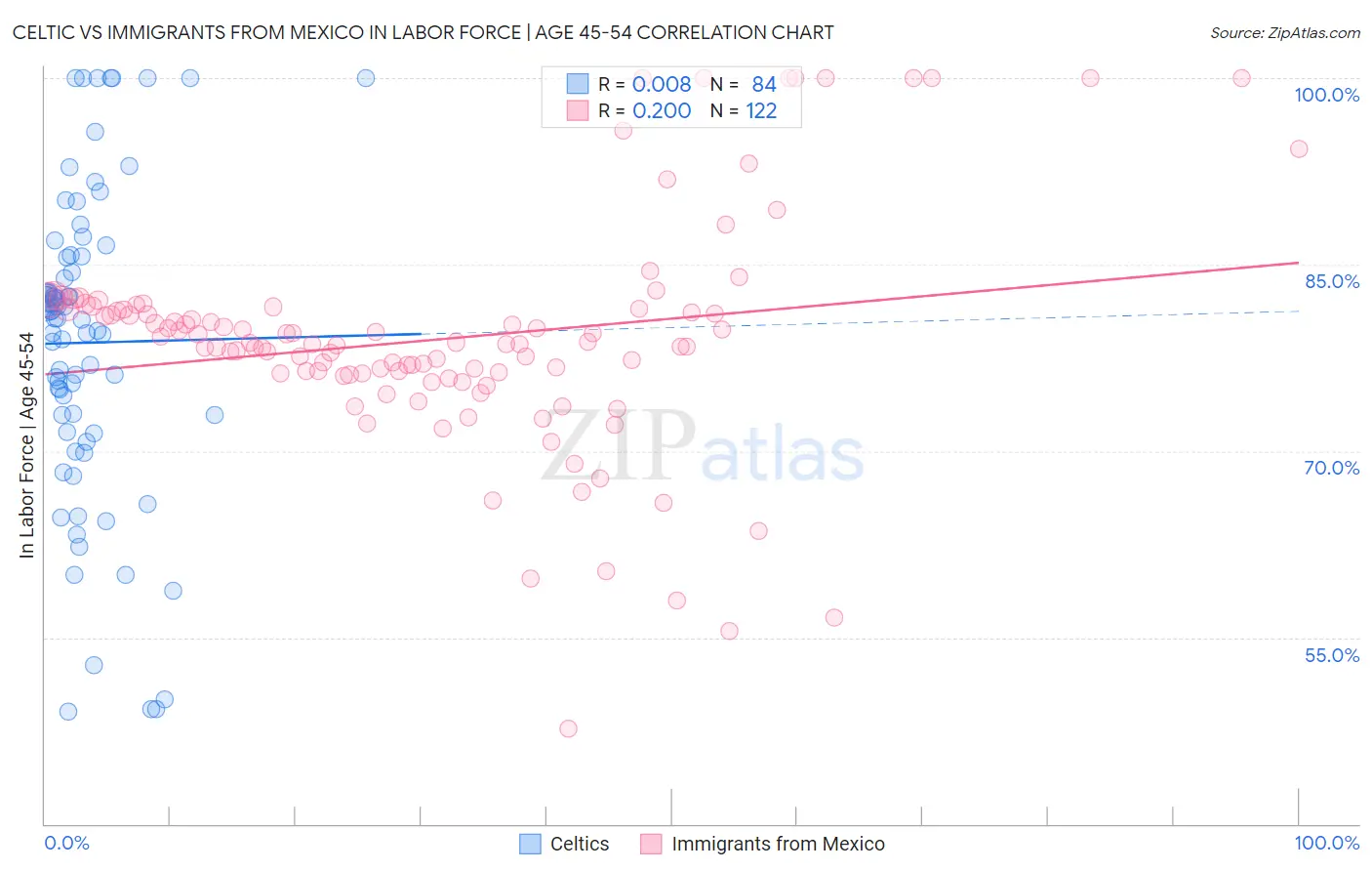 Celtic vs Immigrants from Mexico In Labor Force | Age 45-54 Correlation Chart