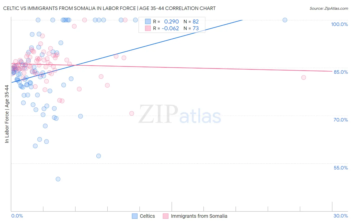 Celtic vs Immigrants from Somalia In Labor Force | Age 35-44 Correlation Chart