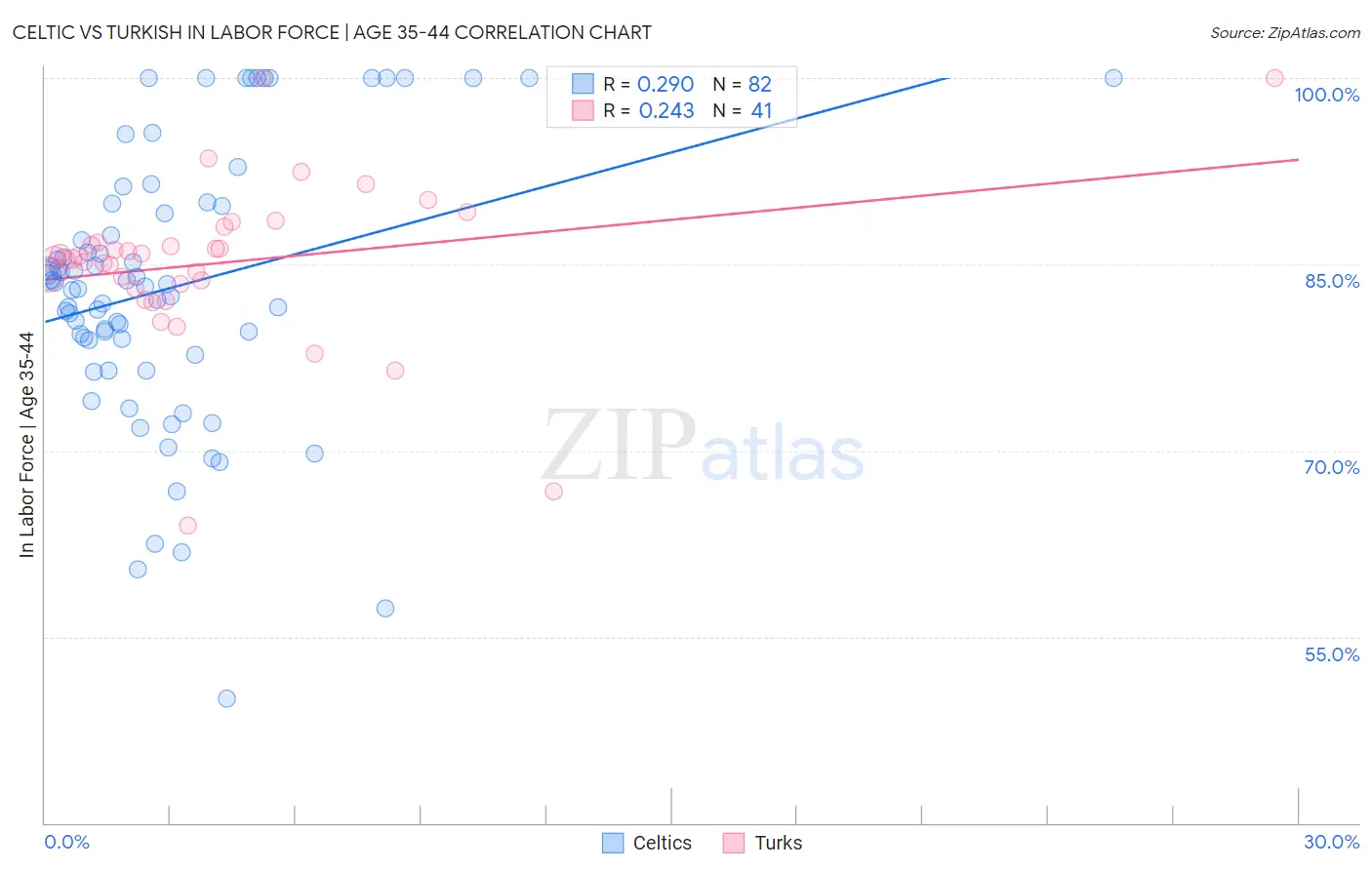 Celtic vs Turkish In Labor Force | Age 35-44 Correlation Chart