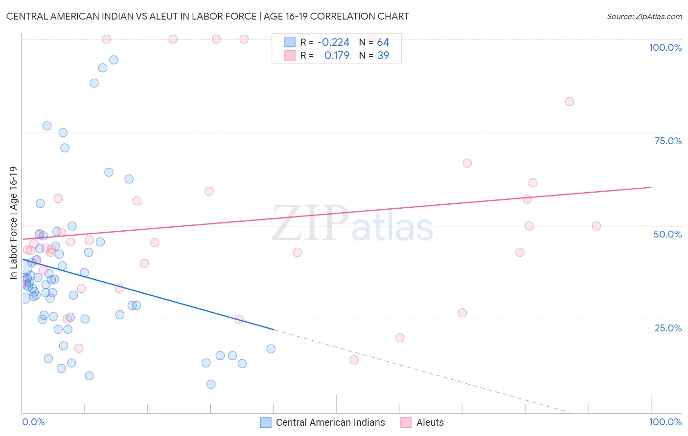Central American Indian vs Aleut In Labor Force | Age 16-19 Correlation Chart