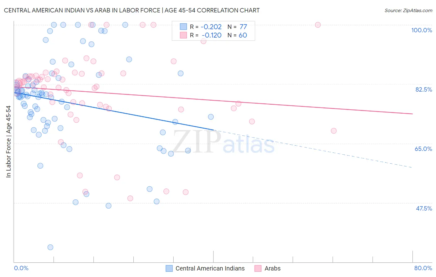 Central American Indian vs Arab In Labor Force | Age 45-54 Correlation Chart