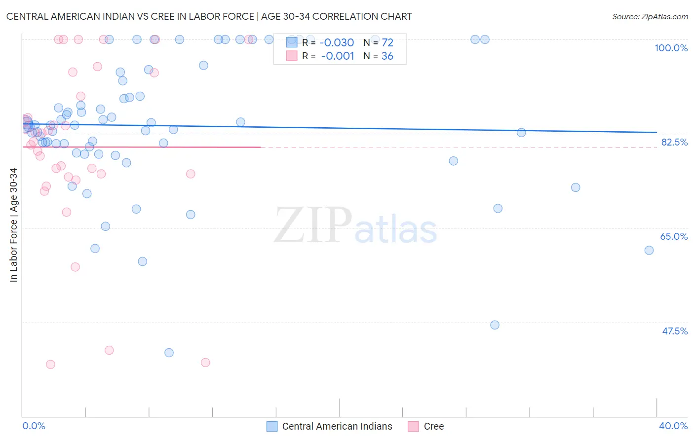 Central American Indian vs Cree In Labor Force | Age 30-34 Correlation Chart