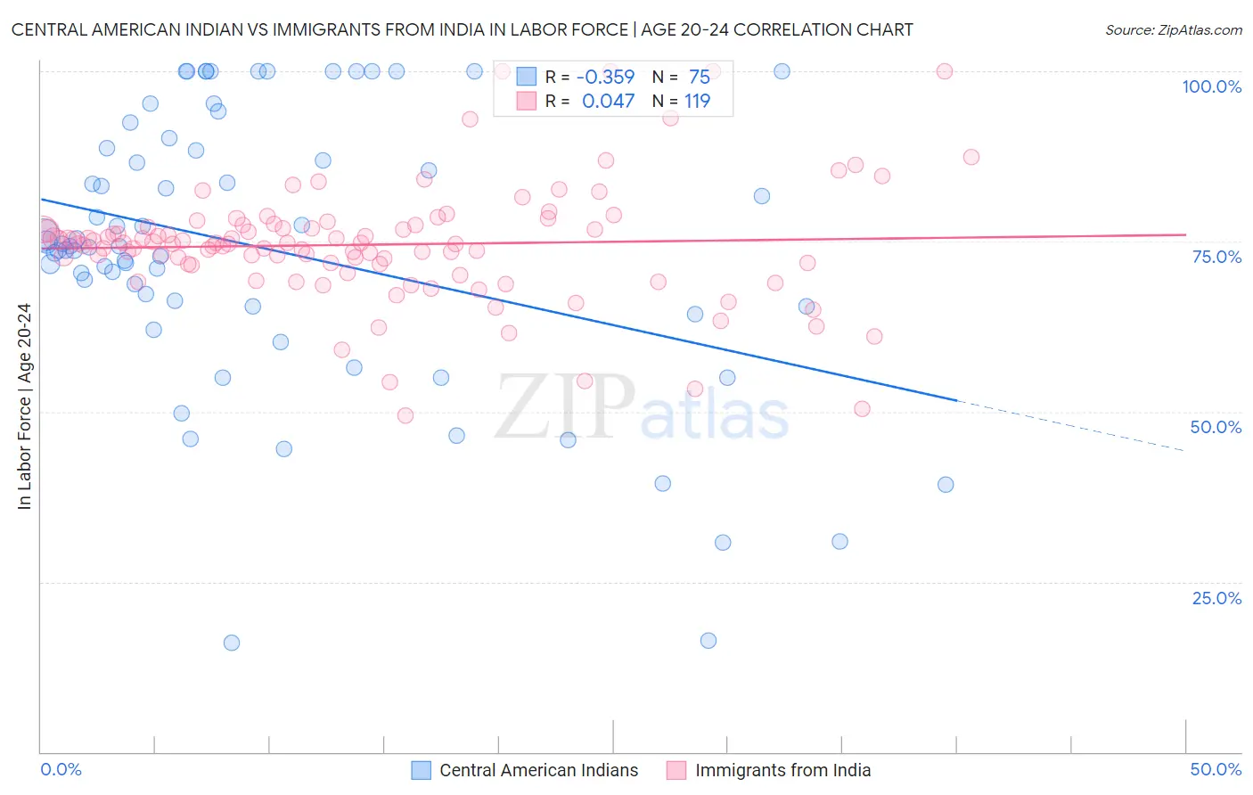 Central American Indian vs Immigrants from India In Labor Force | Age 20-24 Correlation Chart