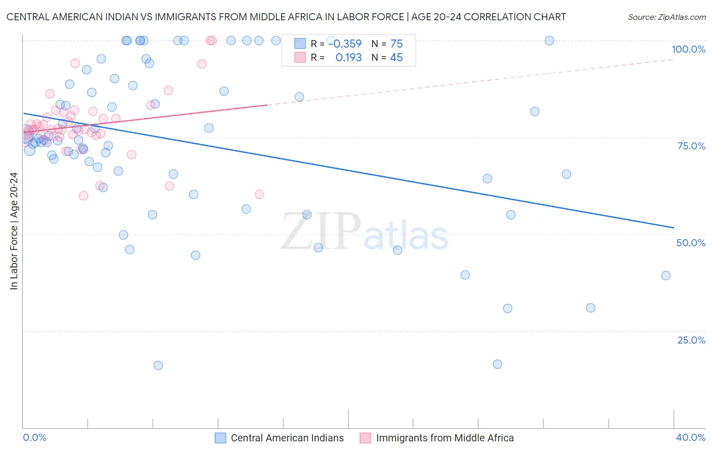 Central American Indian vs Immigrants from Middle Africa In Labor Force | Age 20-24 Correlation Chart