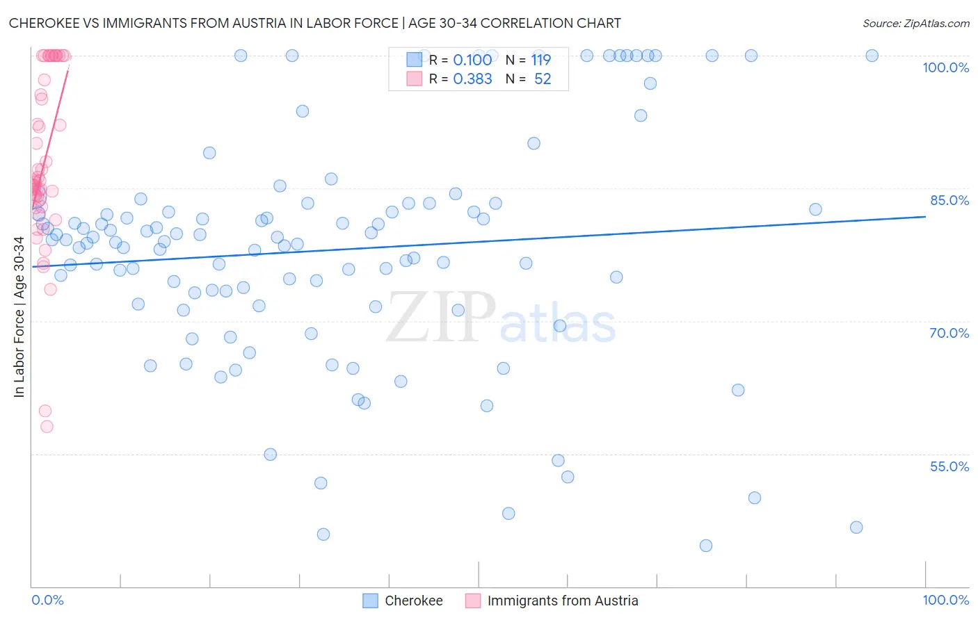 Cherokee vs Immigrants from Austria In Labor Force | Age 30-34 Correlation Chart
