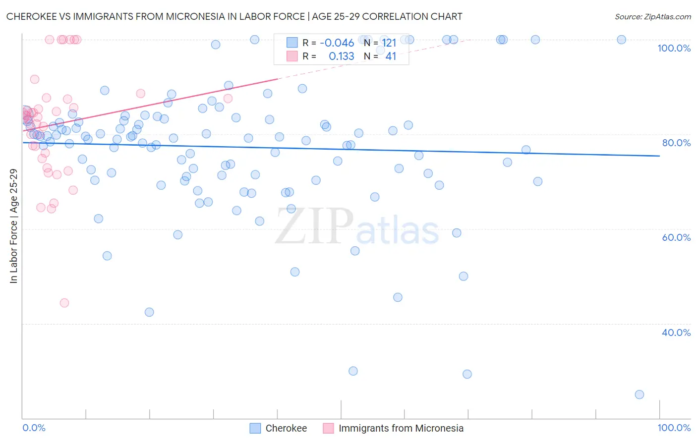 Cherokee vs Immigrants from Micronesia In Labor Force | Age 25-29 Correlation Chart