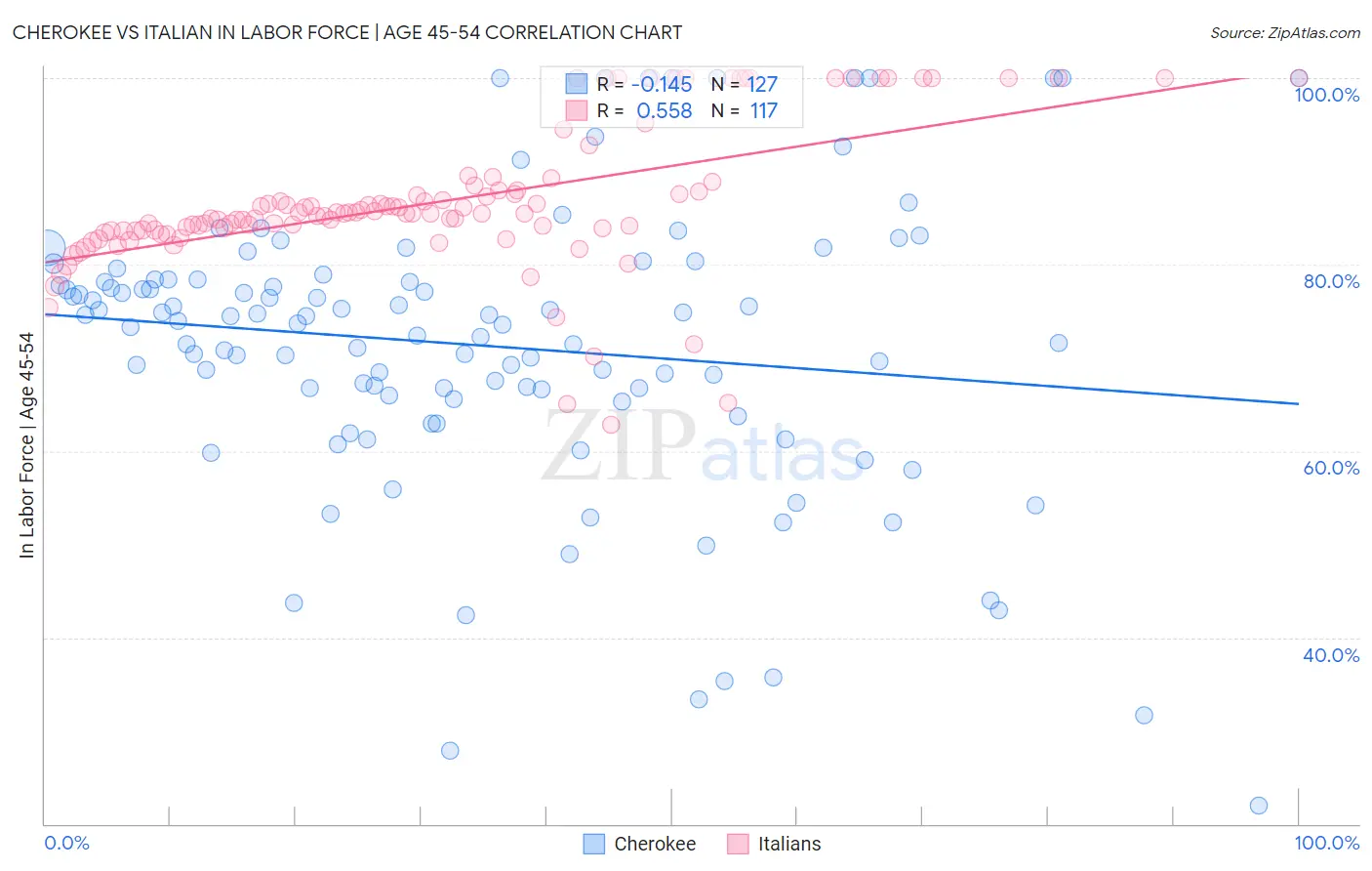 Cherokee vs Italian In Labor Force | Age 45-54 Correlation Chart