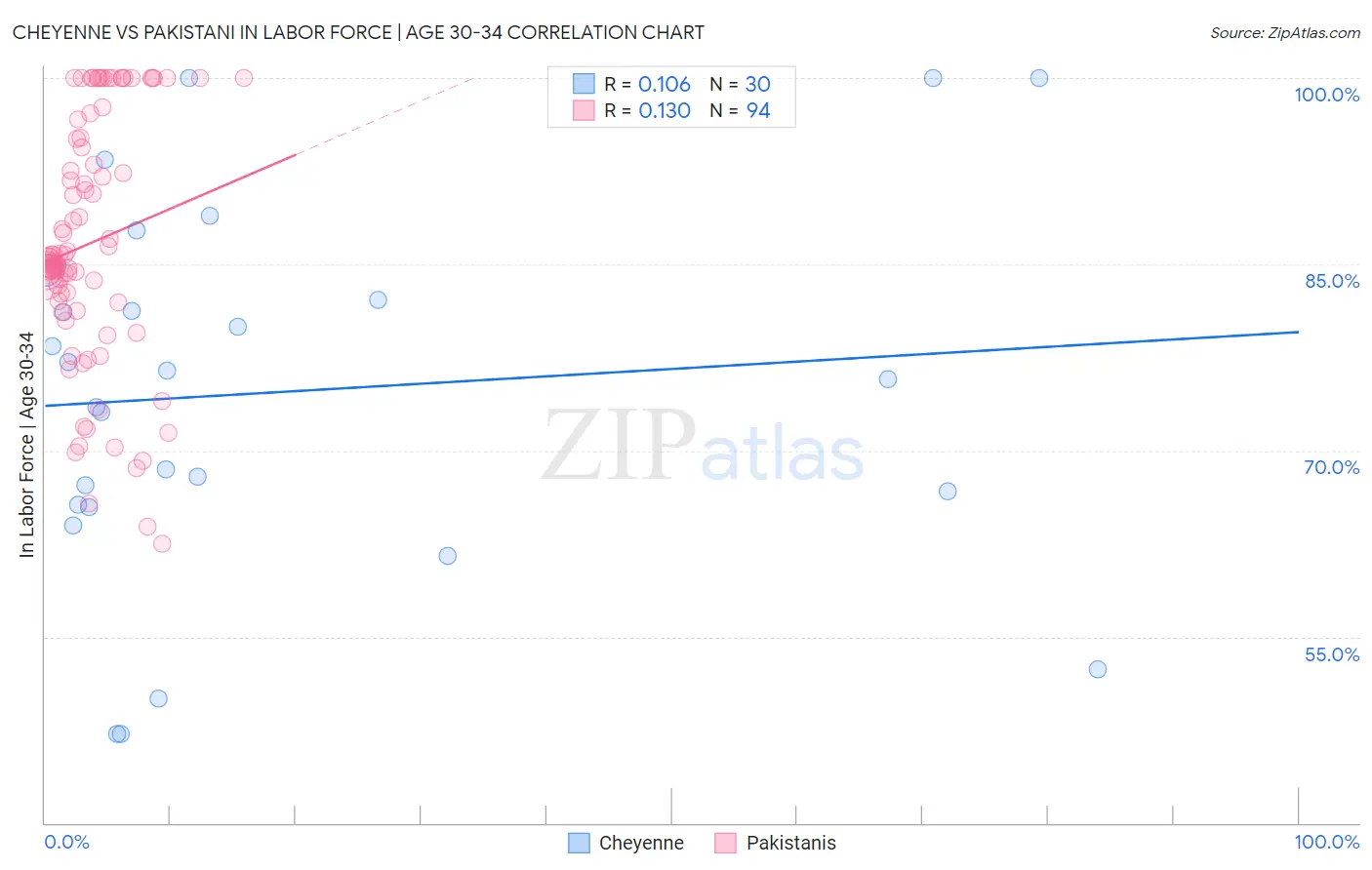 Cheyenne vs Pakistani In Labor Force | Age 30-34 Correlation Chart
