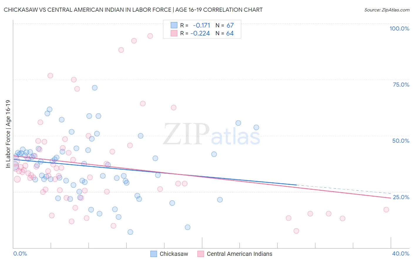 Chickasaw vs Central American Indian In Labor Force | Age 16-19 Correlation Chart