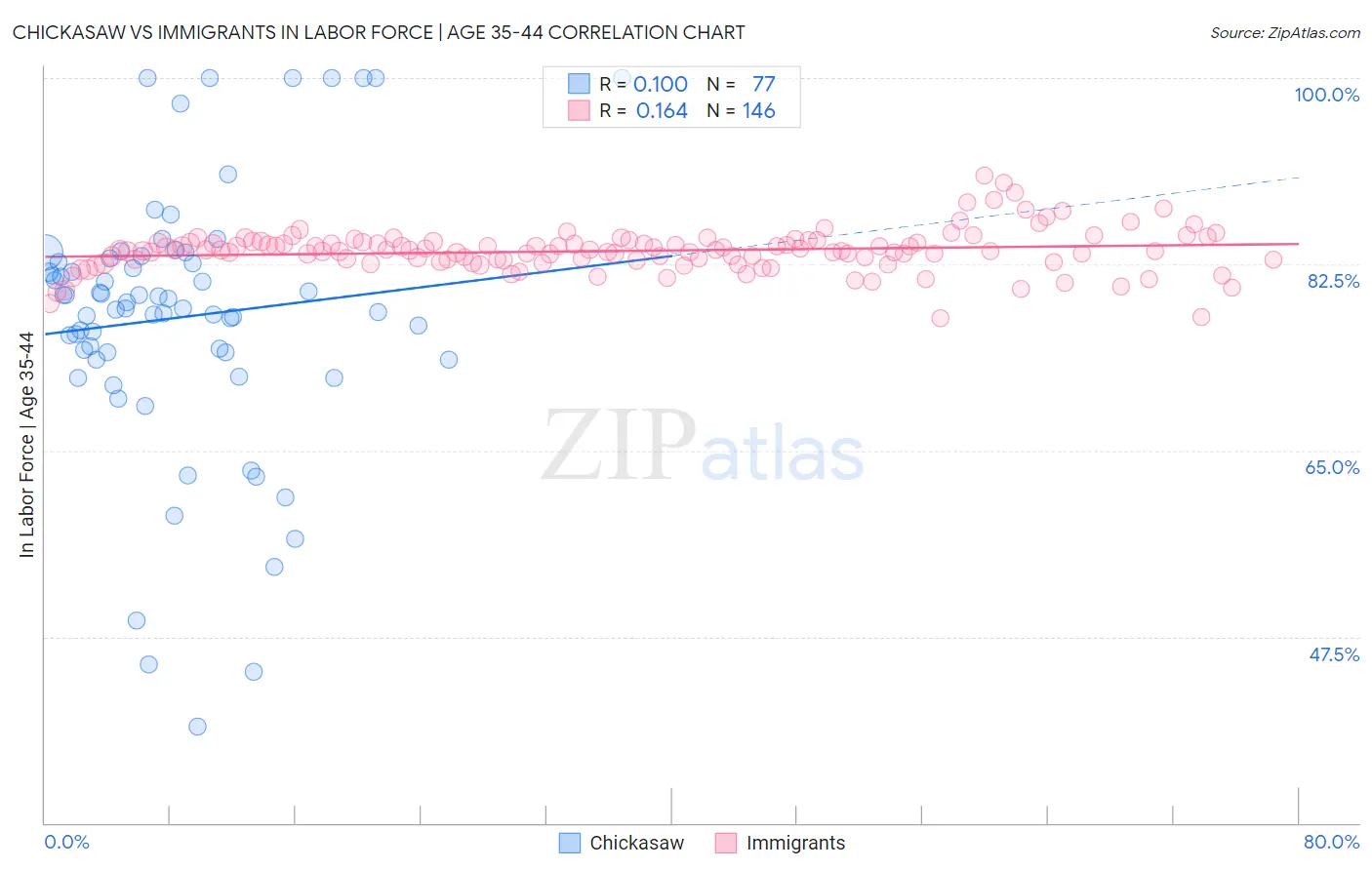 Chickasaw vs Immigrants In Labor Force | Age 35-44 Correlation Chart
