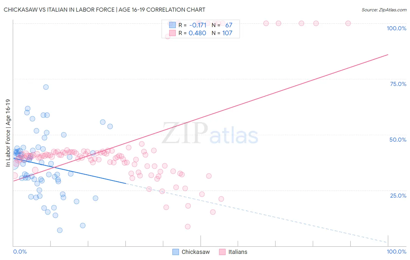 Chickasaw vs Italian In Labor Force | Age 16-19 Correlation Chart