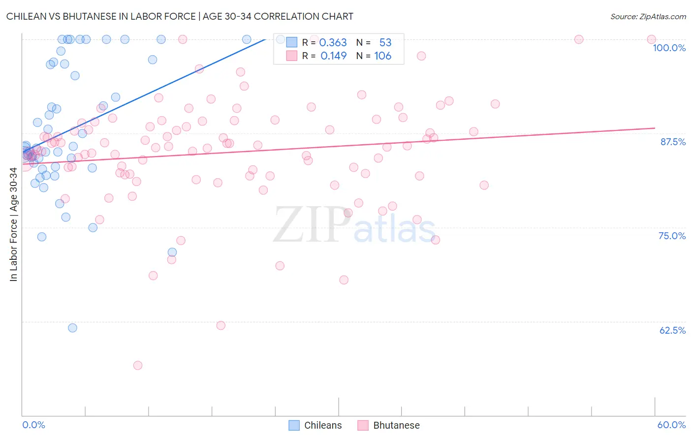 Chilean vs Bhutanese In Labor Force | Age 30-34 Correlation Chart