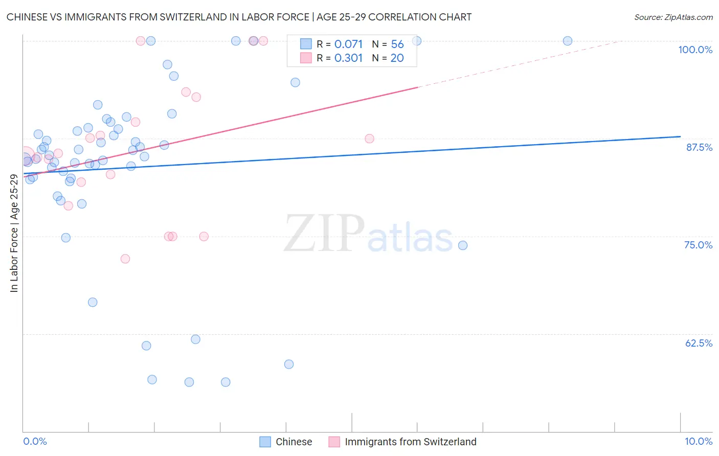 Chinese vs Immigrants from Switzerland In Labor Force | Age 25-29 Correlation Chart
