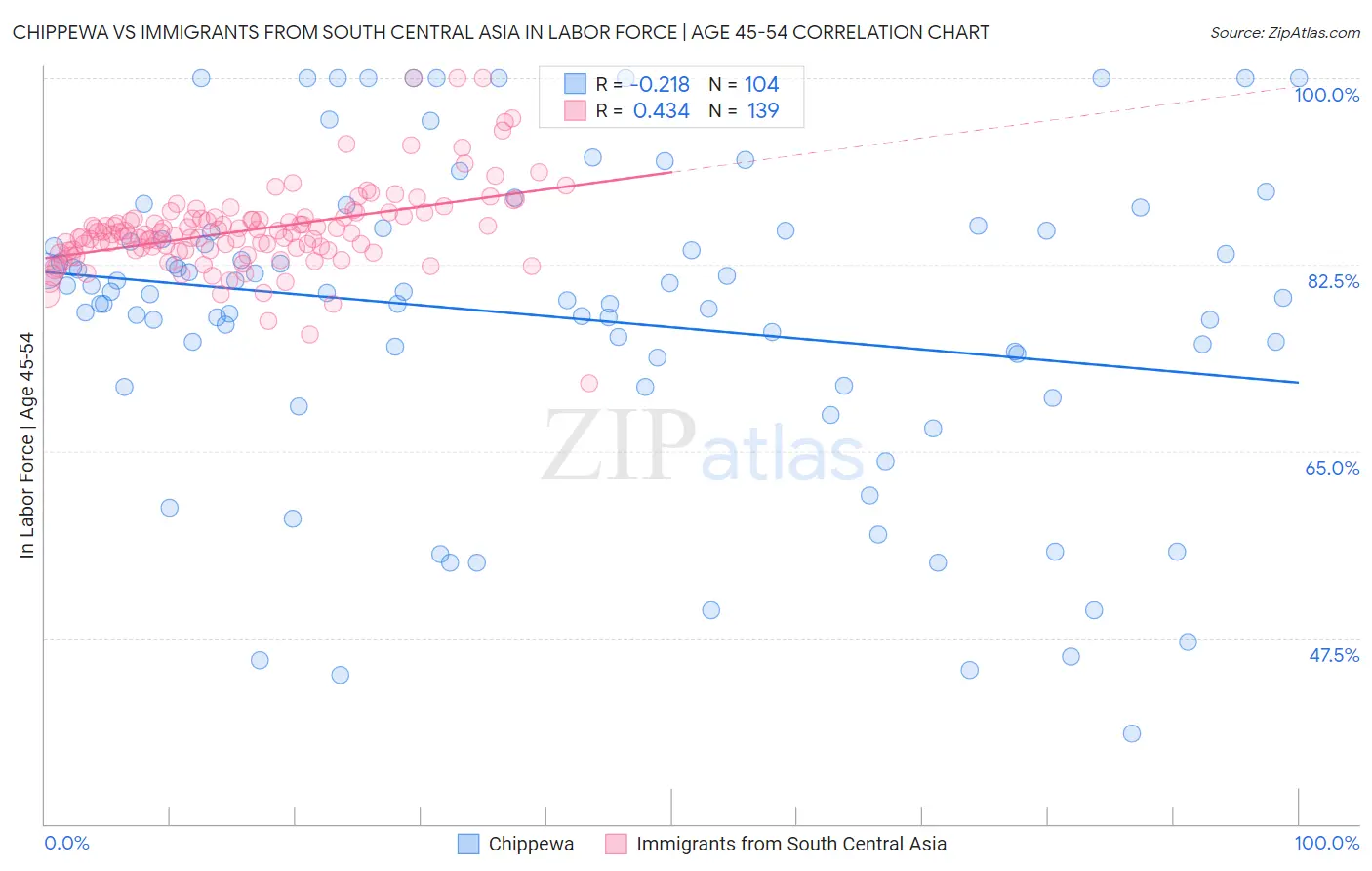 Chippewa vs Immigrants from South Central Asia In Labor Force | Age 45-54 Correlation Chart