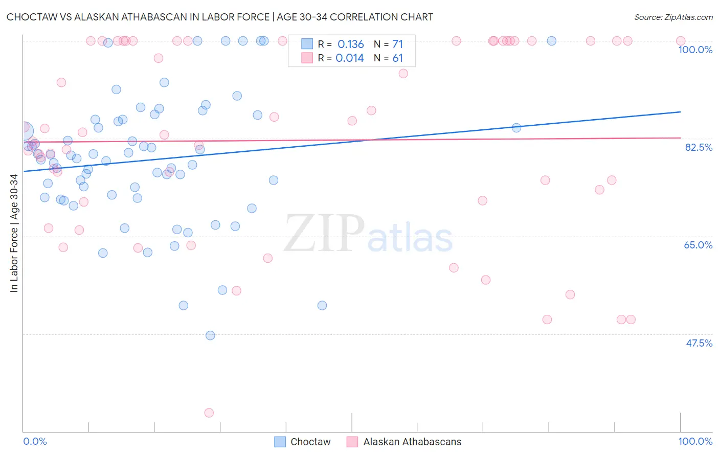 Choctaw vs Alaskan Athabascan In Labor Force | Age 30-34 Correlation Chart