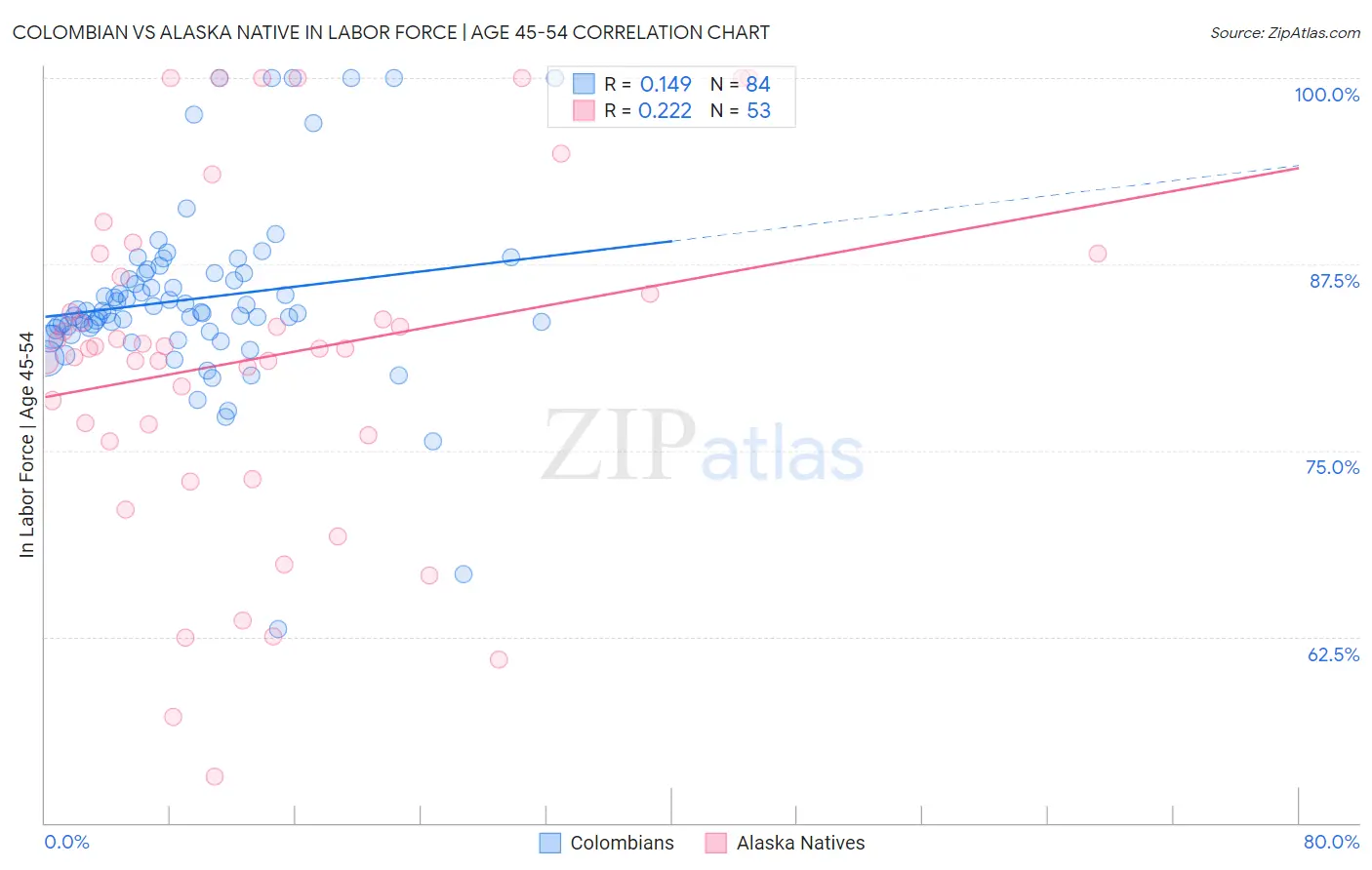 Colombian vs Alaska Native In Labor Force | Age 45-54 Correlation Chart