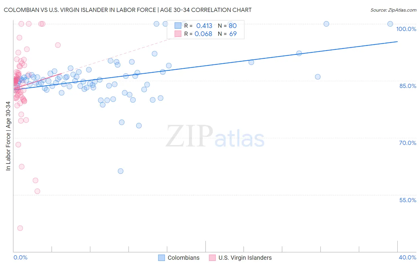 Colombian vs U.S. Virgin Islander In Labor Force | Age 30-34 Correlation Chart