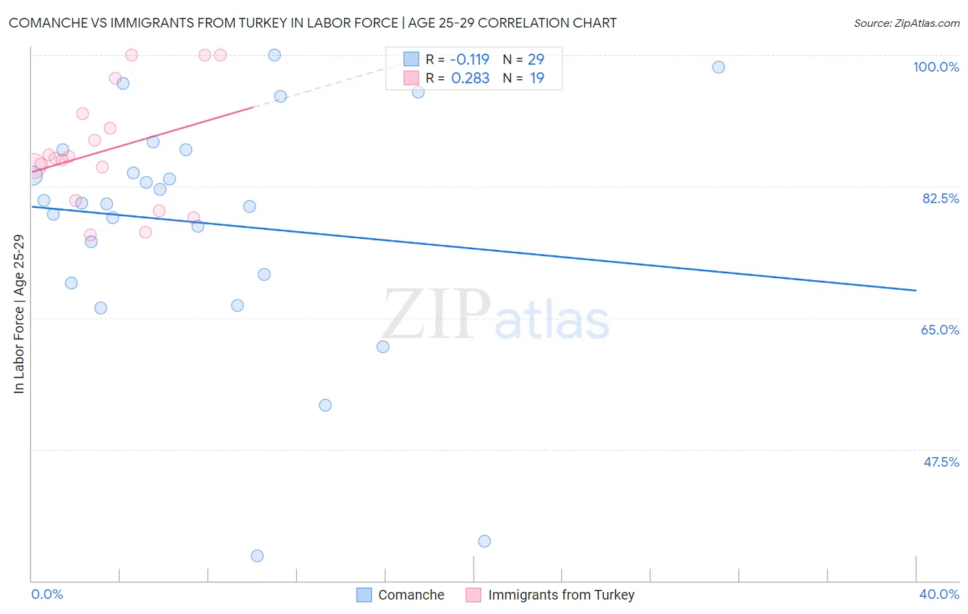 Comanche vs Immigrants from Turkey In Labor Force | Age 25-29 Correlation Chart
