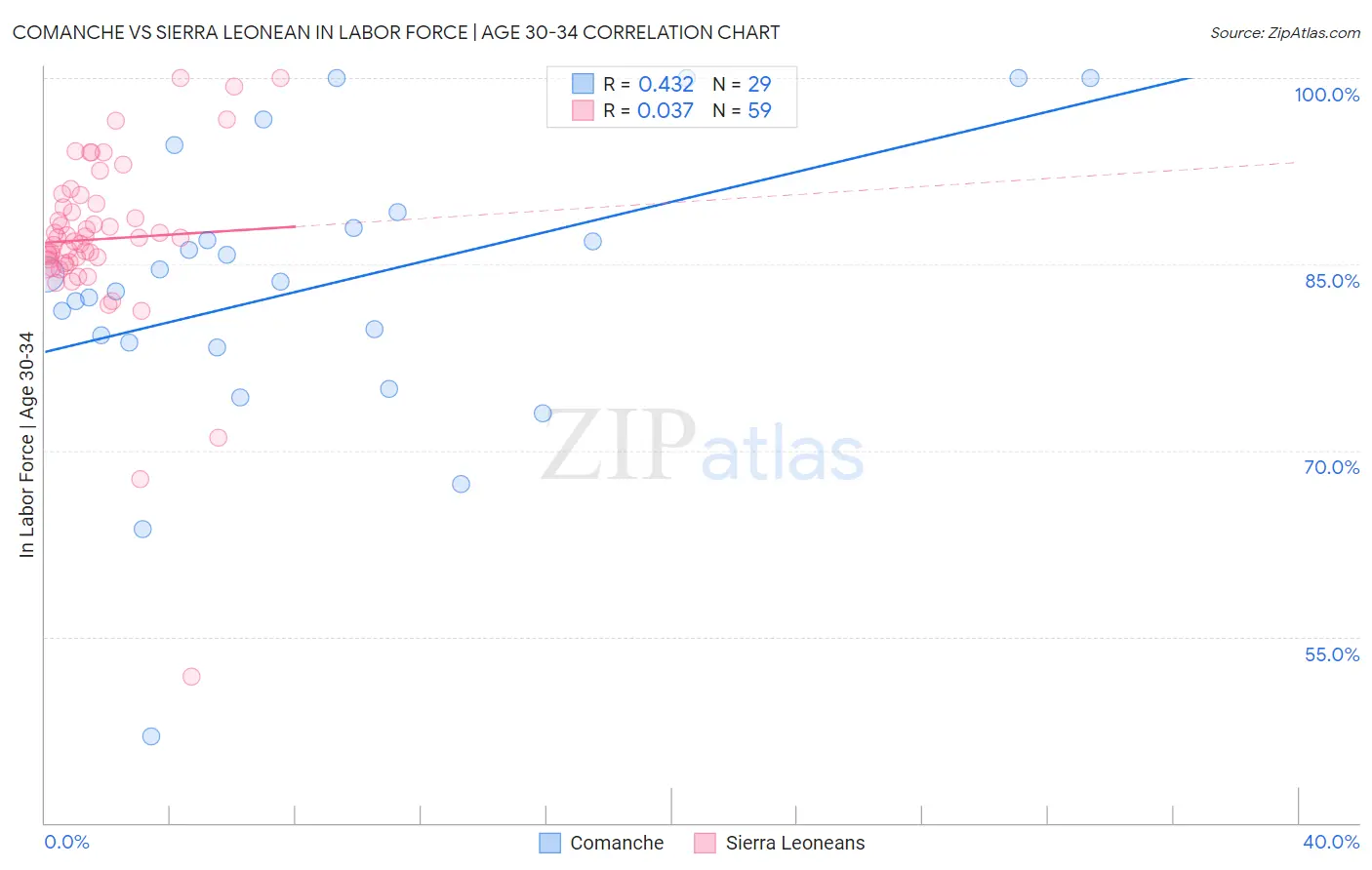 Comanche vs Sierra Leonean In Labor Force | Age 30-34 Correlation Chart