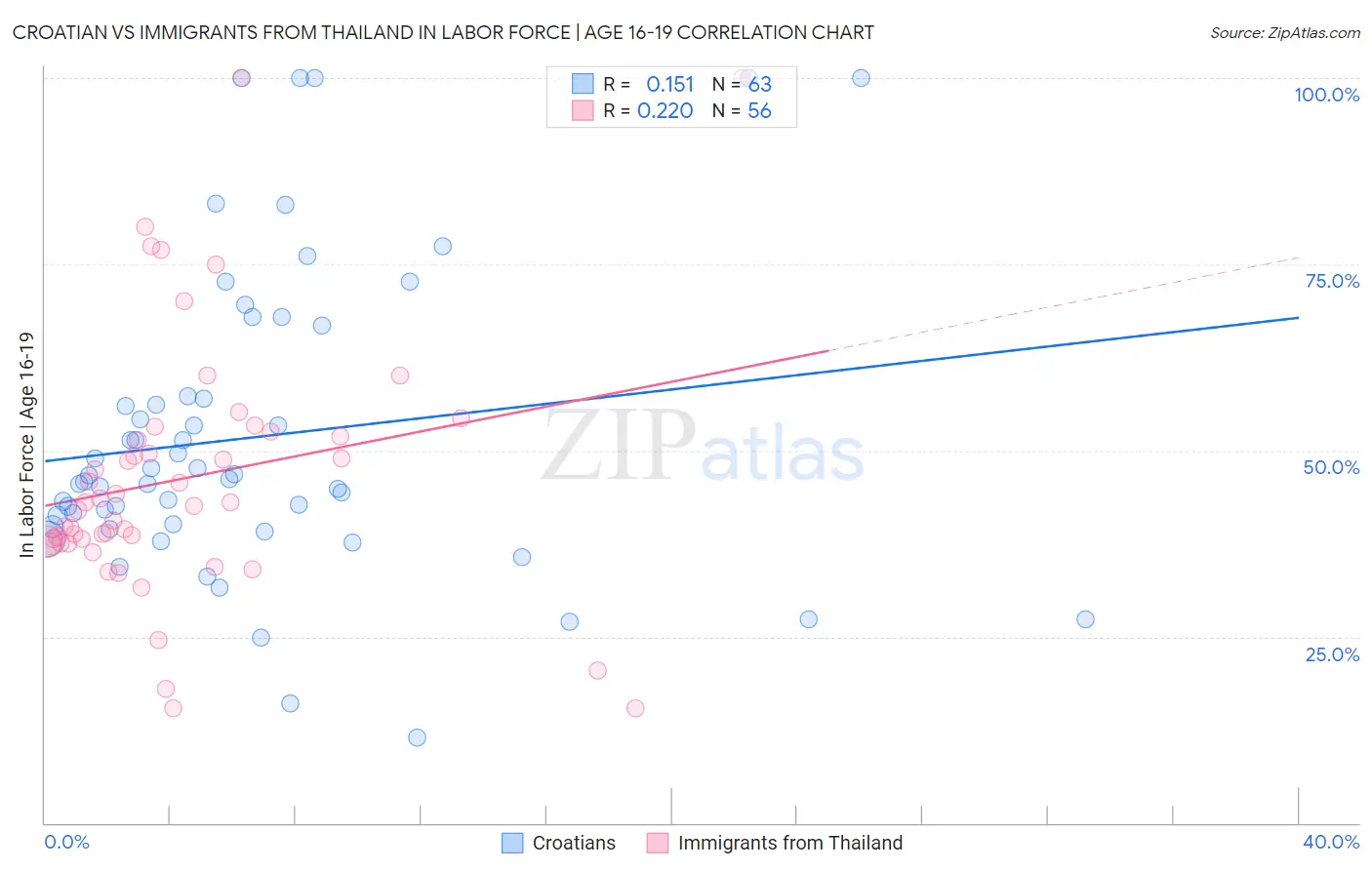 Croatian vs Immigrants from Thailand In Labor Force | Age 16-19 Correlation Chart