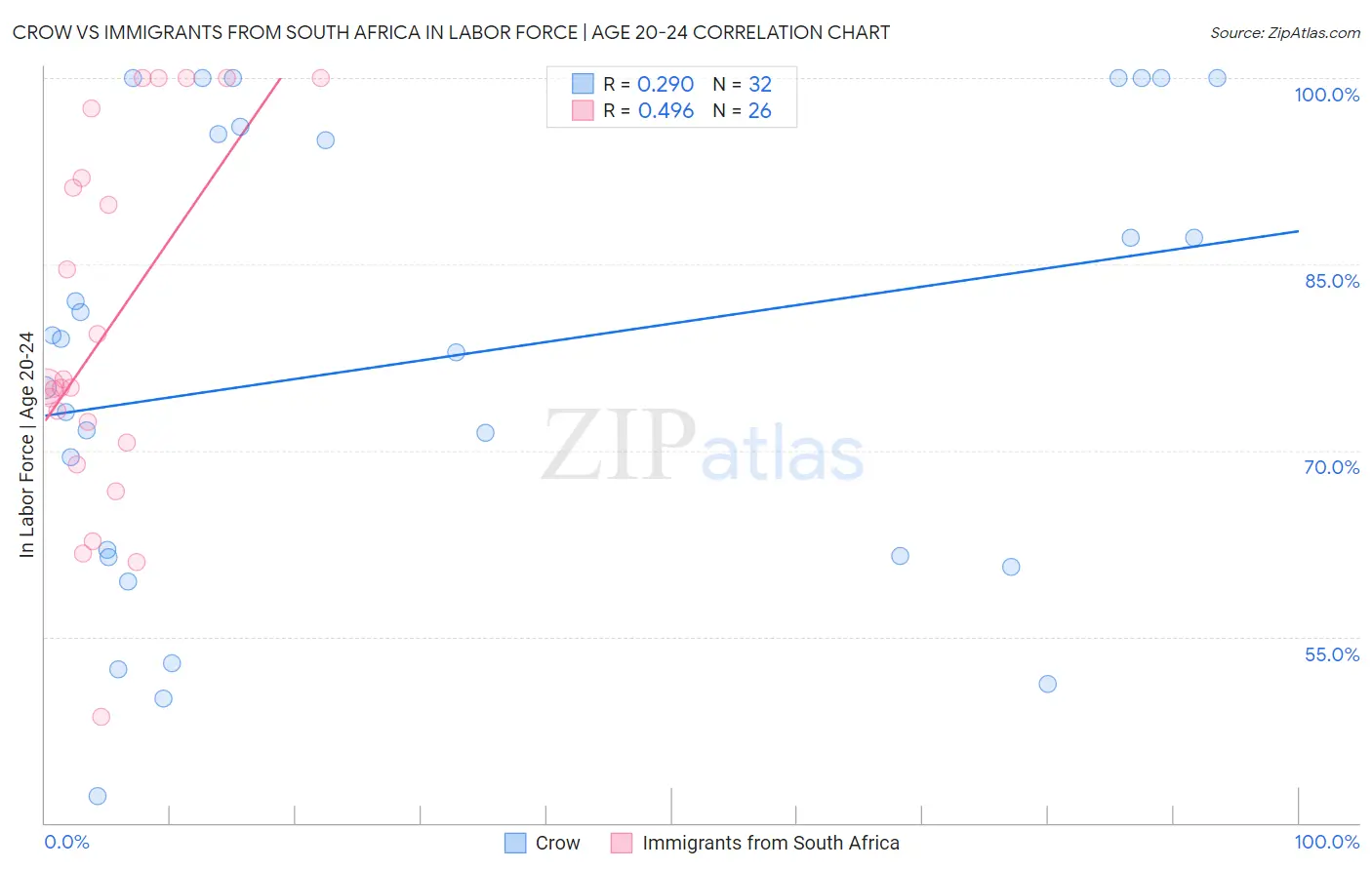 Crow vs Immigrants from South Africa In Labor Force | Age 20-24 Correlation Chart