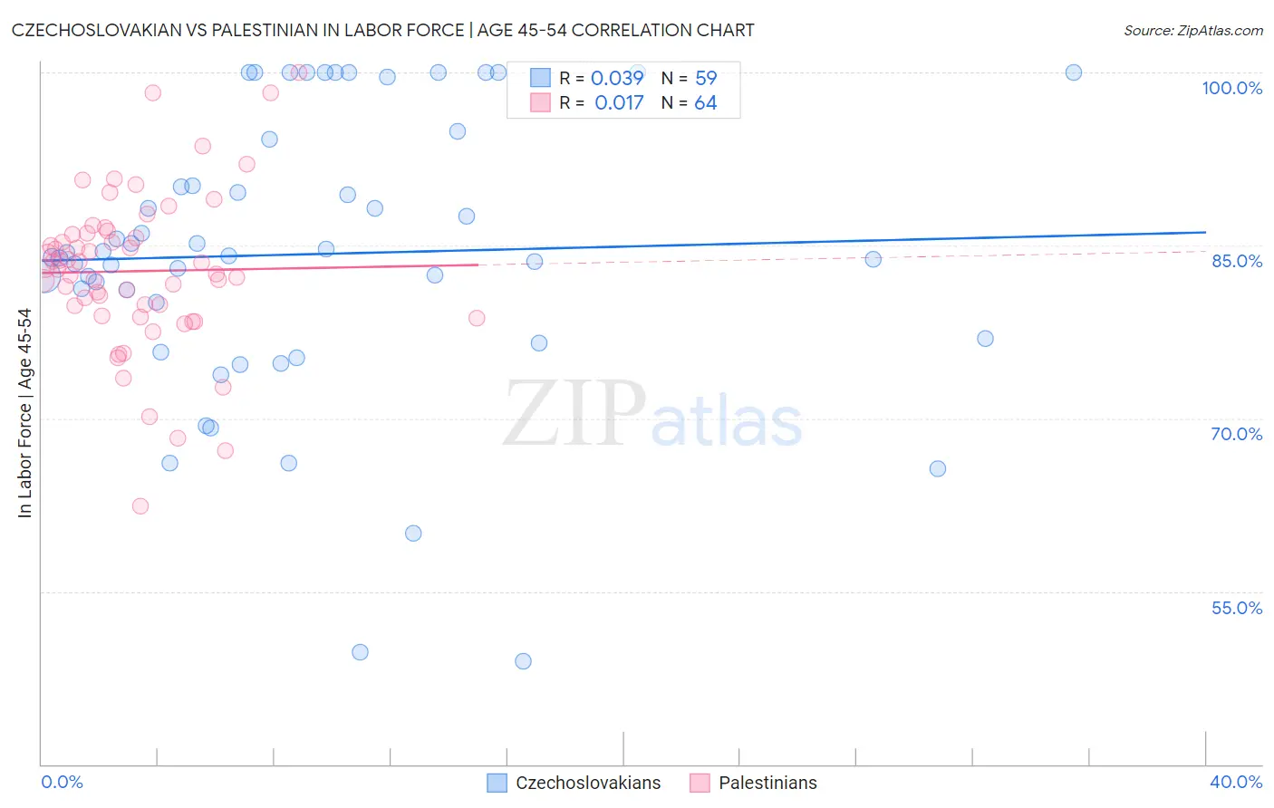 The statistical analysis conducted on geographies consisting of 368,521,801 people shows no correlation between the proportion of Czechoslovakians and labor force participation rate among population between the ages 45 and 54 in the United States with a correlation coefficient (R) of 0.039 and weighted average of 83.0%. Similarly, the statistical analysis conducted on geographies consisting of 216,394,682 people shows no correlation between the proportion of Palestinians and labor force participation rate among population between the ages 45 and 54 in the United States with a correlation coefficient (R) of 0.017 and weighted average of 83.3%, a difference of 0.40%.