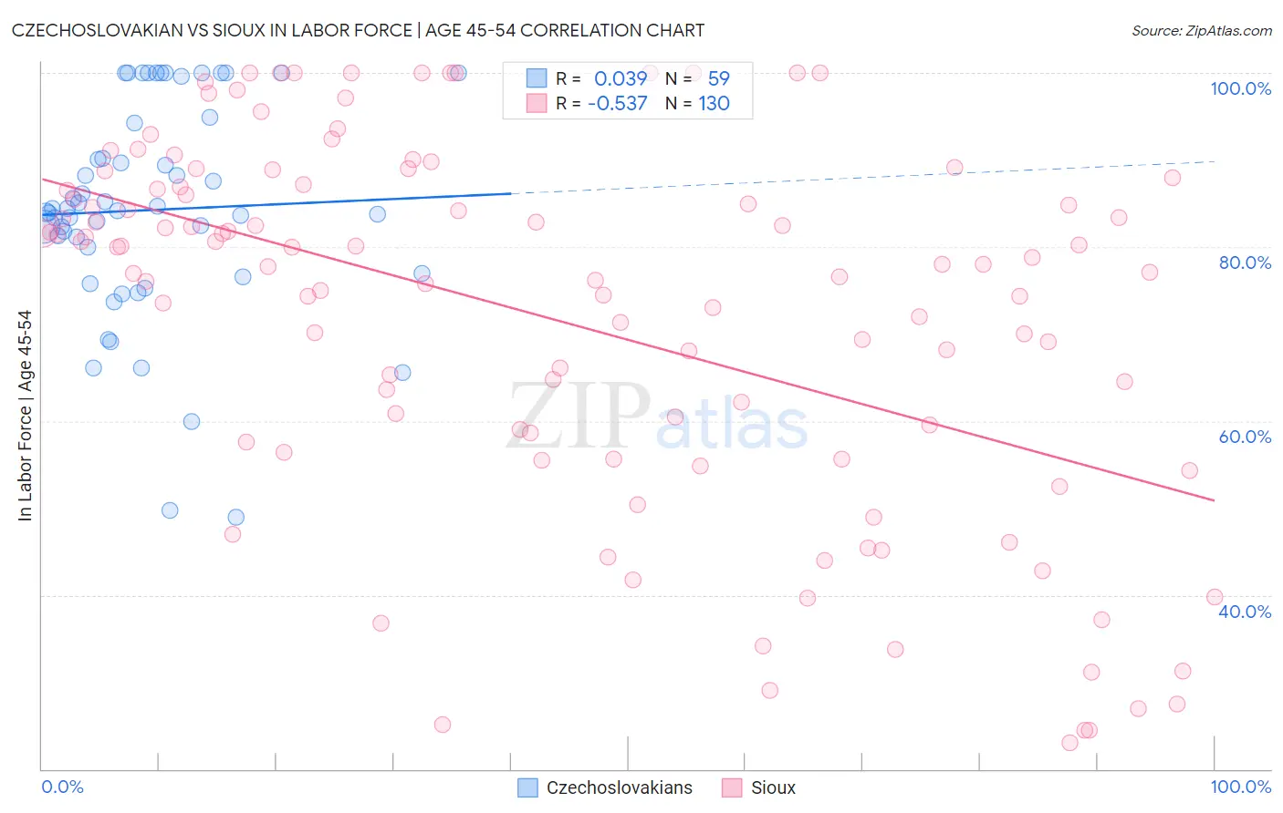 Czechoslovakian vs Sioux In Labor Force | Age 45-54 Correlation Chart