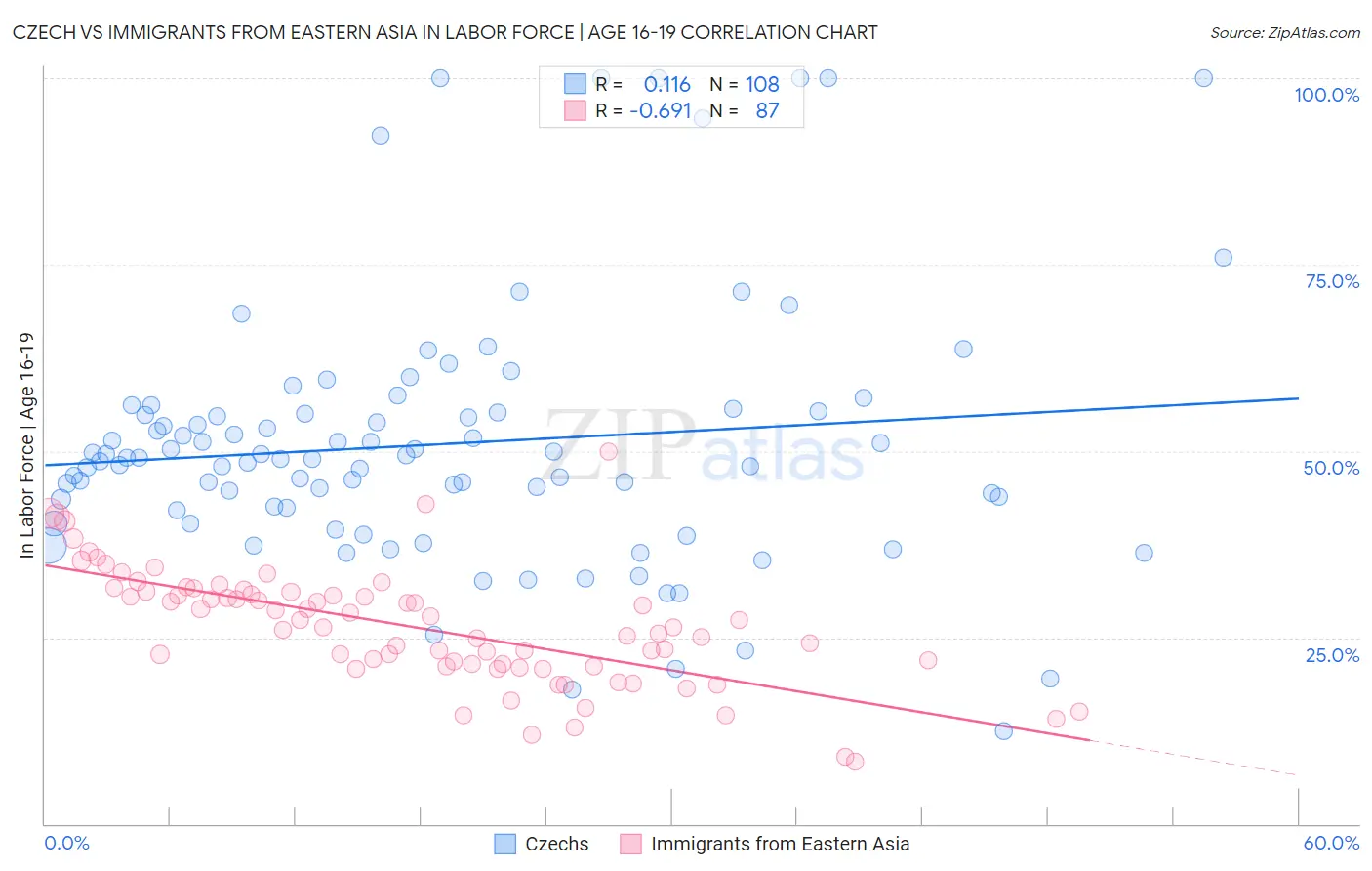 Czech vs Immigrants from Eastern Asia In Labor Force | Age 16-19 Correlation Chart