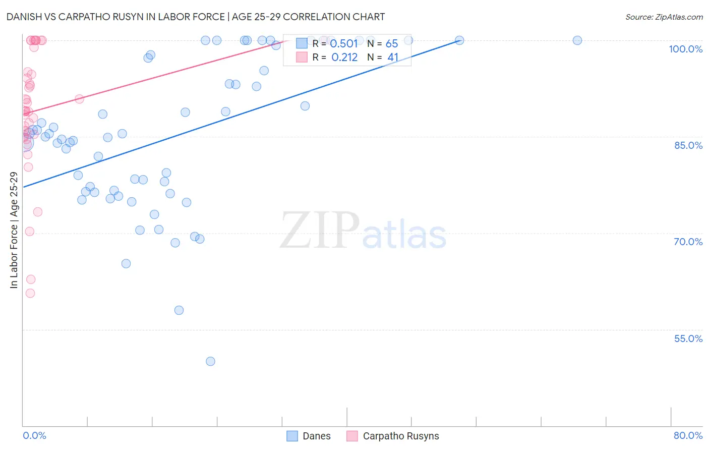 Danish vs Carpatho Rusyn In Labor Force | Age 25-29 Correlation Chart