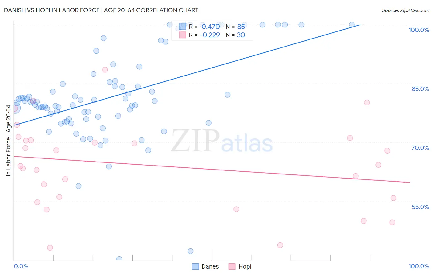 Danish vs Hopi In Labor Force | Age 20-64 Correlation Chart