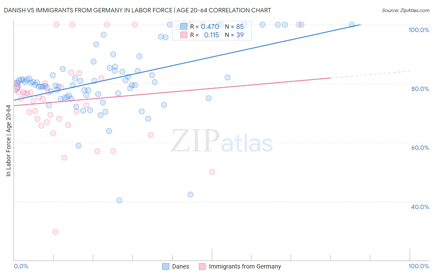 Danish vs Immigrants from Germany In Labor Force | Age 20-64 Correlation Chart