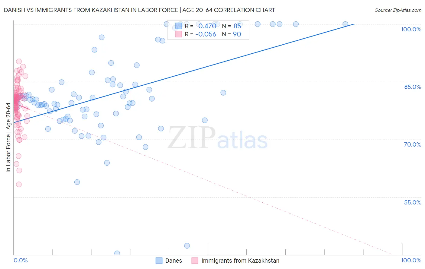 Danish vs Immigrants from Kazakhstan In Labor Force | Age 20-64 Correlation Chart