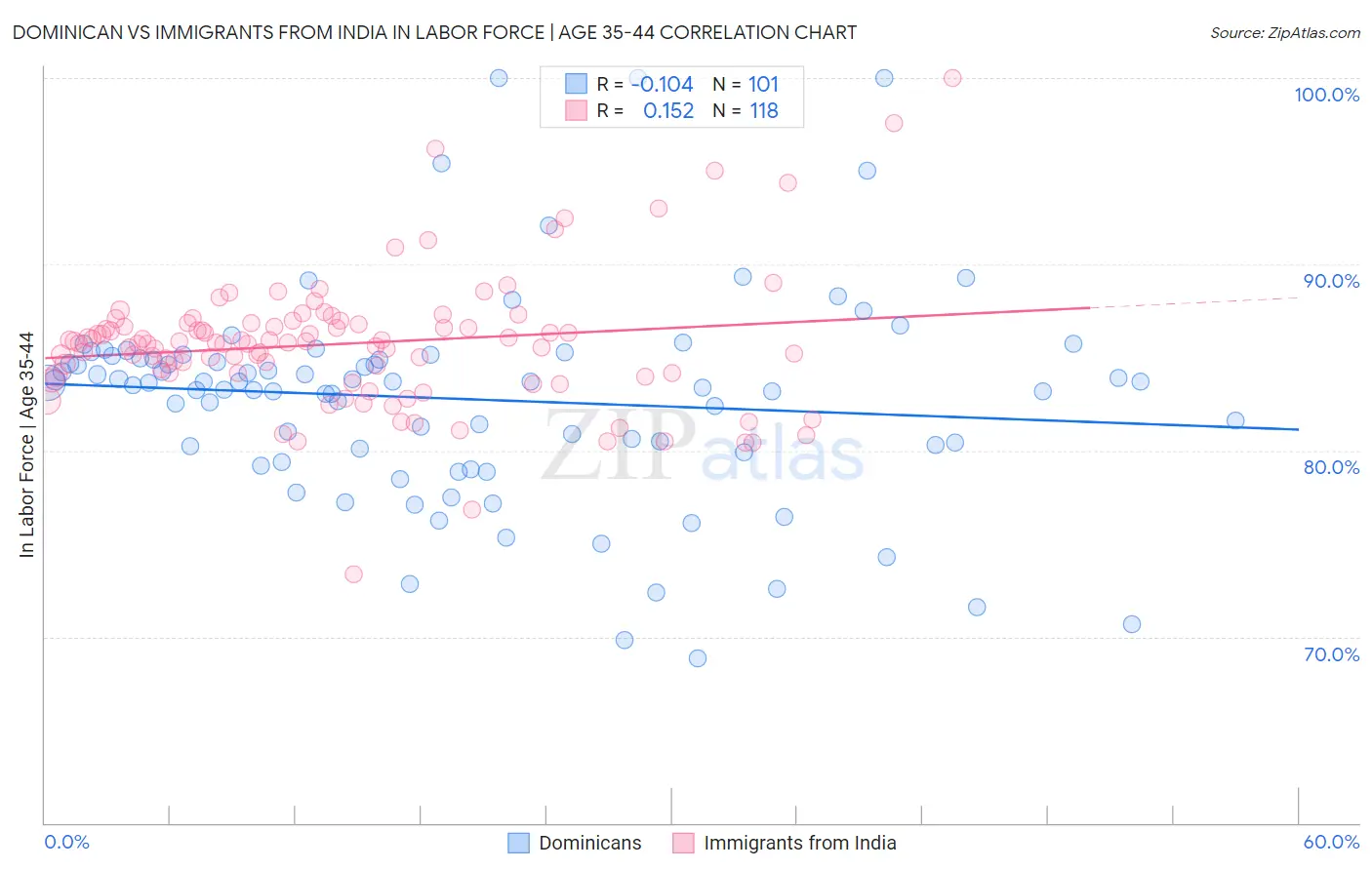 Dominican vs Immigrants from India In Labor Force | Age 35-44 Correlation Chart