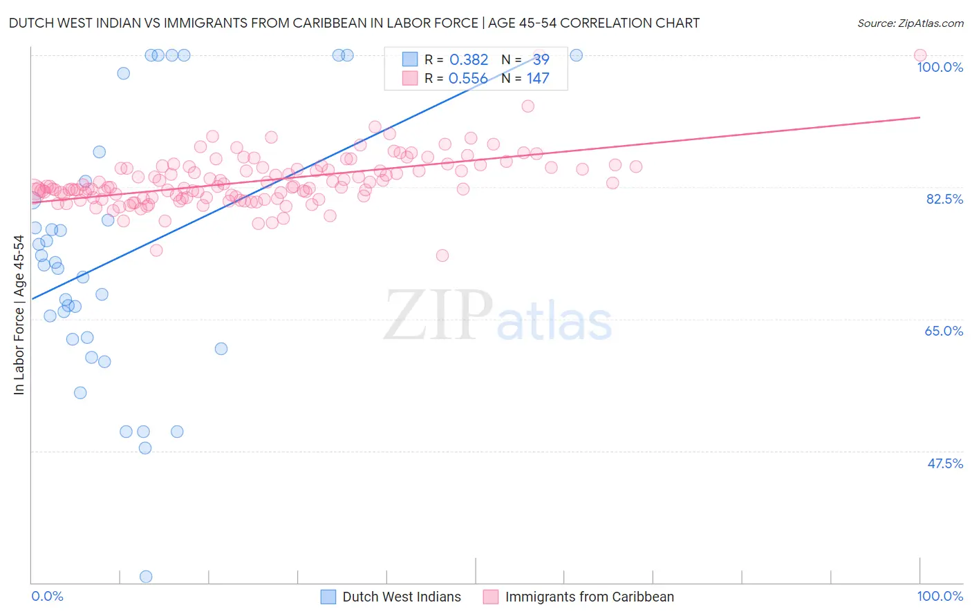 Dutch West Indian vs Immigrants from Caribbean In Labor Force | Age 45-54 Correlation Chart