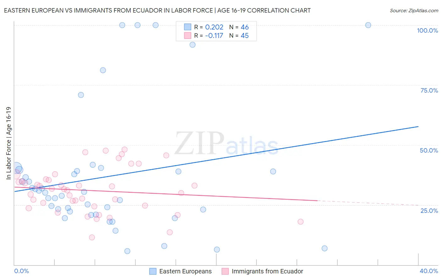 Eastern European vs Immigrants from Ecuador In Labor Force | Age 16-19 Correlation Chart