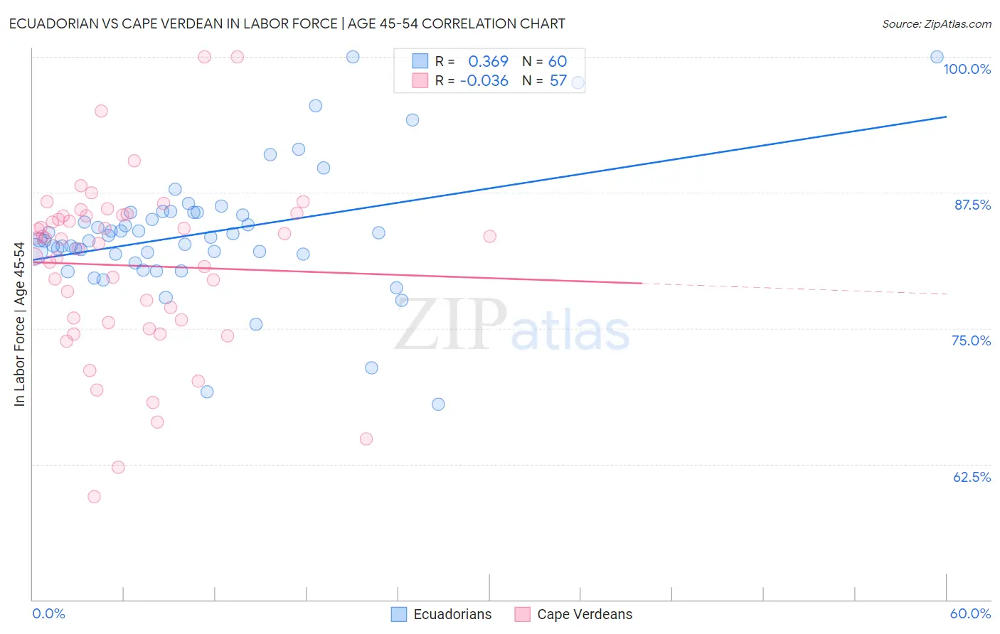 Ecuadorian vs Cape Verdean In Labor Force | Age 45-54 Correlation Chart