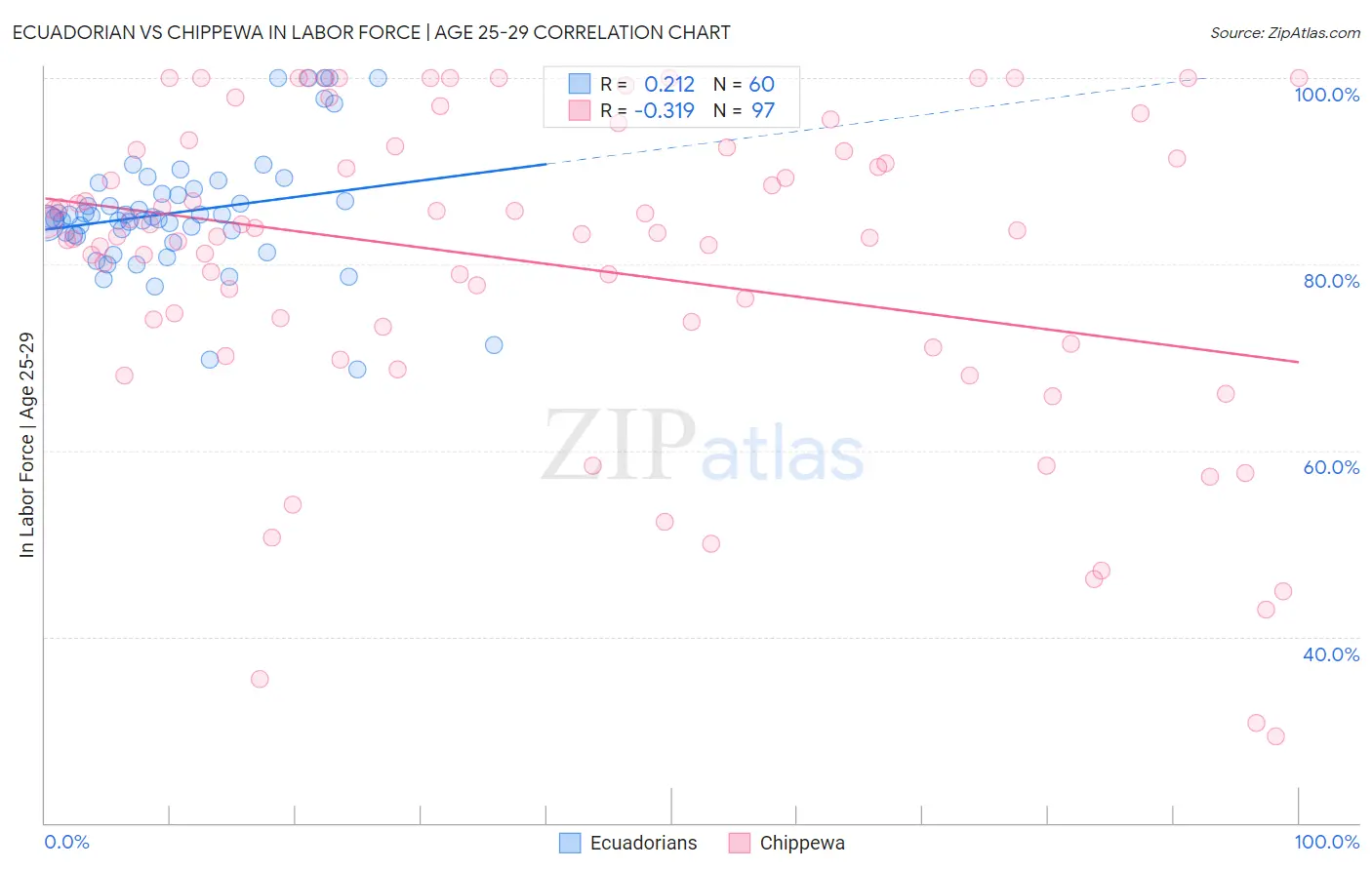 Ecuadorian vs Chippewa In Labor Force | Age 25-29 Correlation Chart