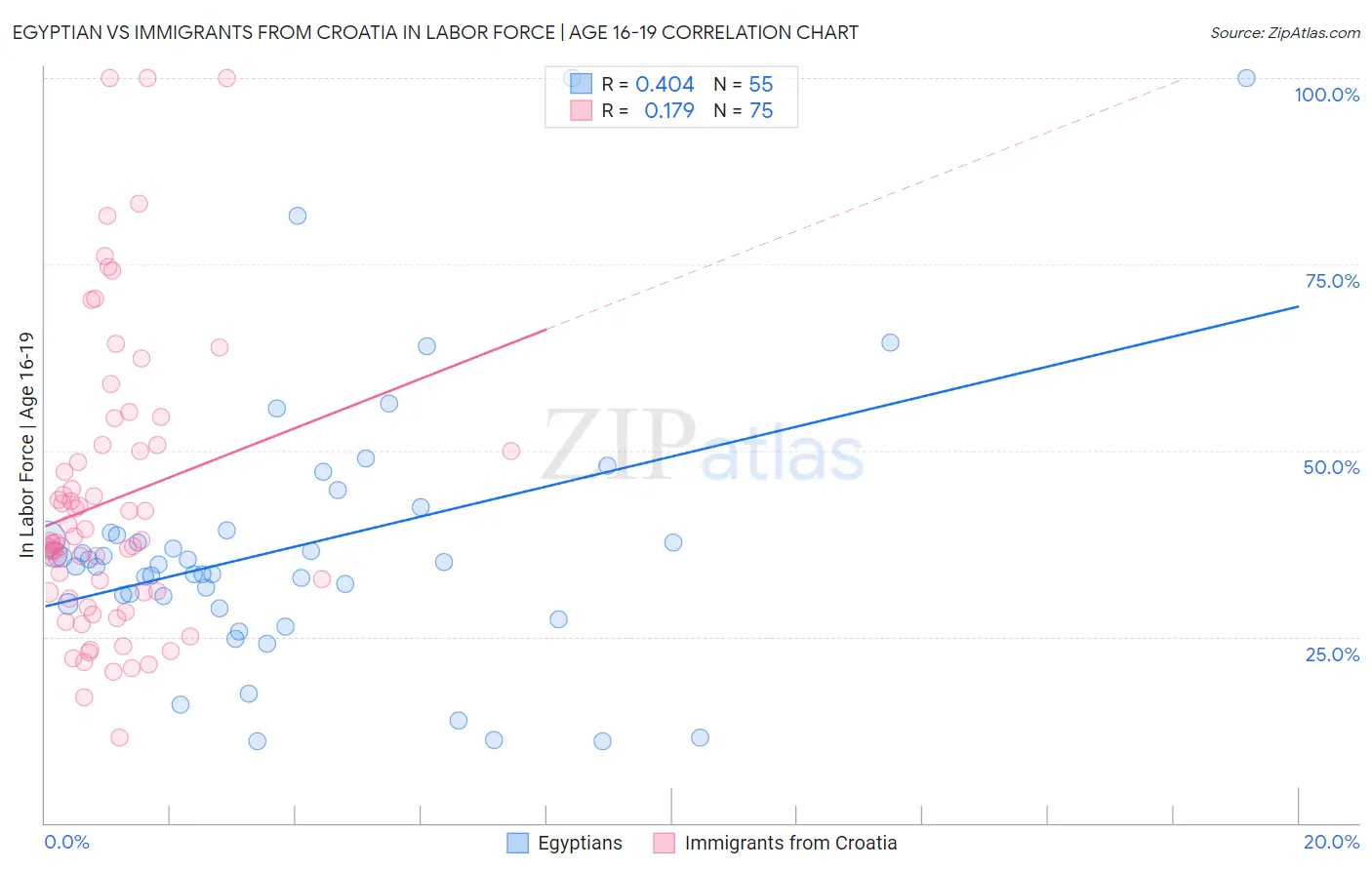 Egyptian vs Immigrants from Croatia In Labor Force | Age 16-19 Correlation Chart