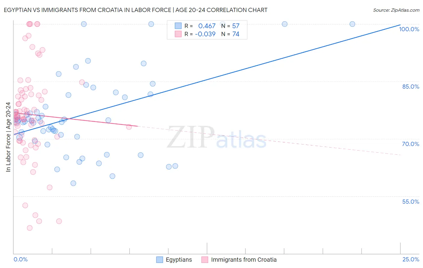 Egyptian vs Immigrants from Croatia In Labor Force | Age 20-24 Correlation Chart