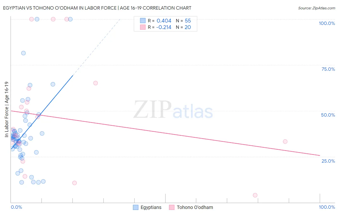 Egyptian vs Tohono O'odham In Labor Force | Age 16-19 Correlation Chart