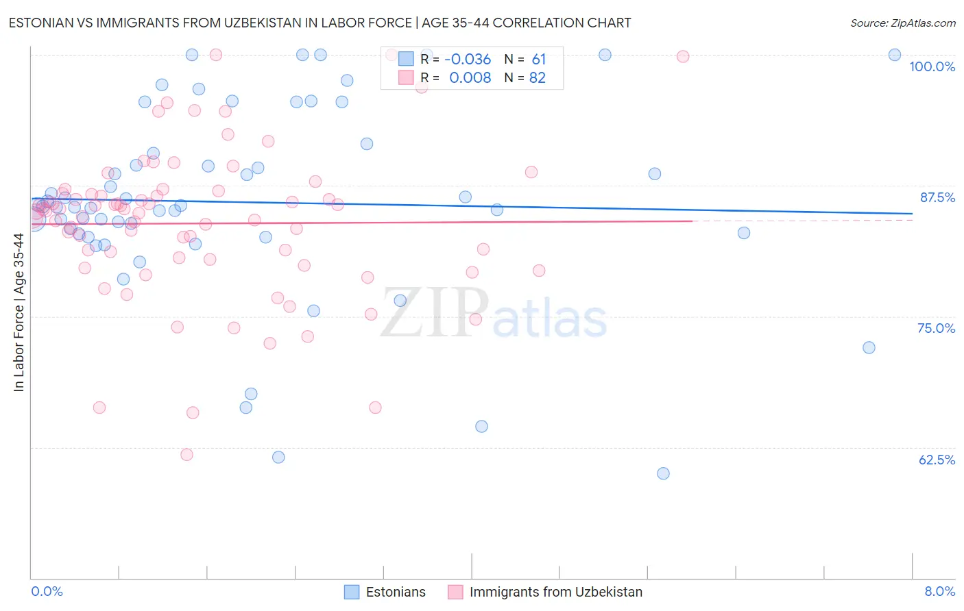 The statistical analysis conducted on geographies consisting of 123,503,374 people shows no correlation between the proportion of Estonians and labor force participation rate among population between the ages 35 and 44 in the United States with a correlation coefficient (R) of -0.036 and weighted average of 85.3%. Similarly, the statistical analysis conducted on geographies consisting of 118,733,606 people shows no correlation between the proportion of Immigrants from Uzbekistan and labor force participation rate among population between the ages 35 and 44 in the United States with a correlation coefficient (R) of 0.008 and weighted average of 84.2%, a difference of 1.3%.