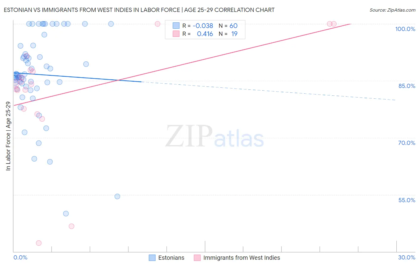 Estonian vs Immigrants from West Indies In Labor Force | Age 25-29 Correlation Chart