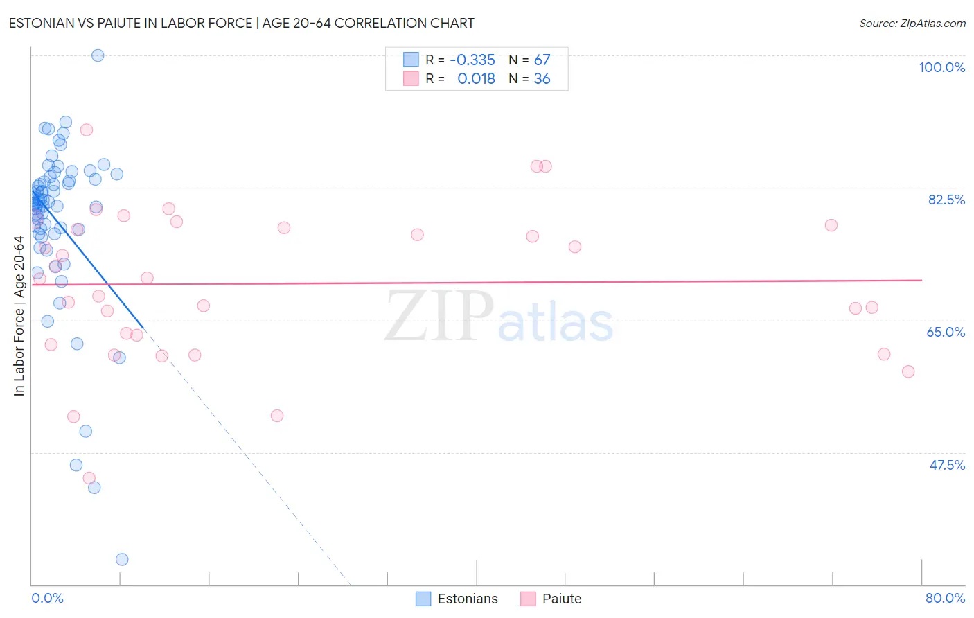 Estonian vs Paiute In Labor Force | Age 20-64 Correlation Chart